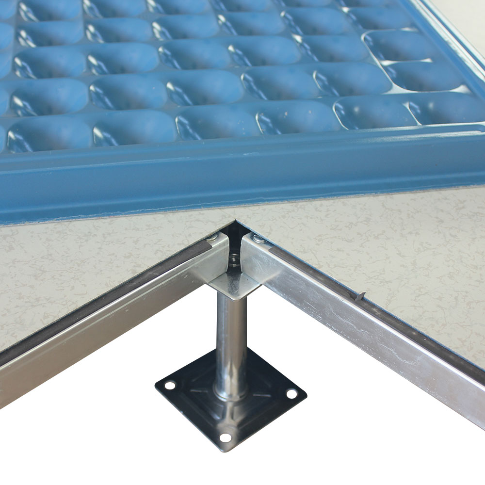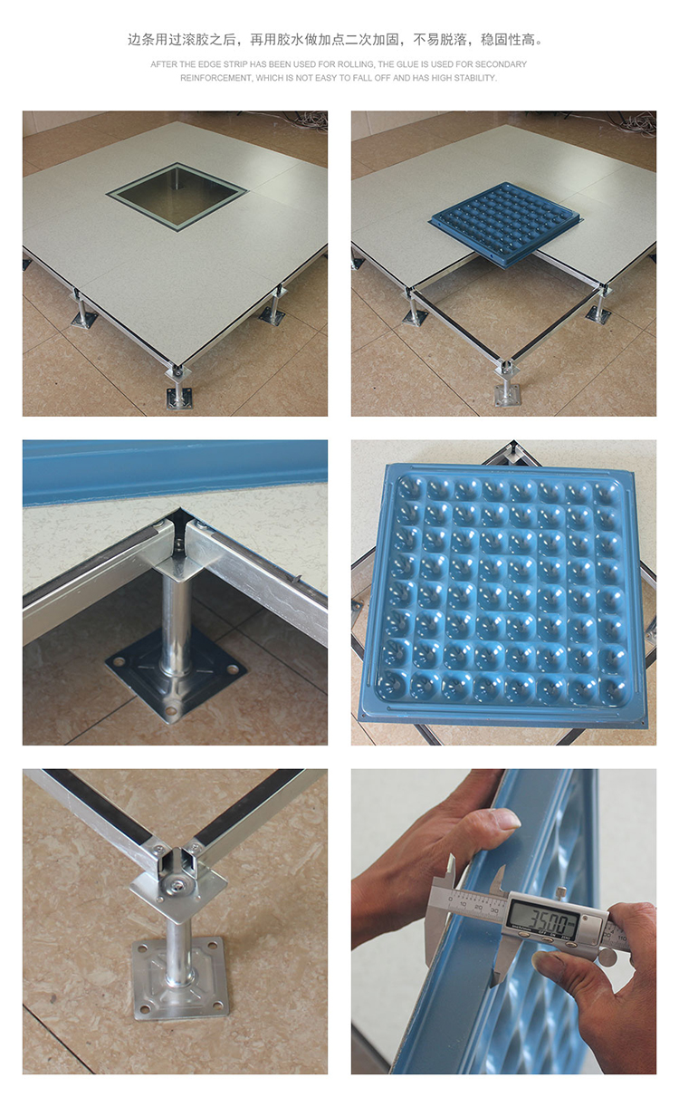 全鋼防靜電地板為全鋼組件,分有邊、無邊、微邊(三種邊處理方式)。底面采用SPCC深沖冷軋板拉伸成型鋼板厚度(0.4~1.5mm),球窩狀結構,增加地板的機械荷載強度。面板采用硬質SPCC鋼板(0.5~2.0mm),上下經過點焊焊接成型,切邊沖孔后,經防銹處理,環(huán)氧樹脂粉末靜電噴涂后,中間填充發(fā)泡水泥(可以根據(jù)客戶需求發(fā)泡不同重量),再經過日曬養(yǎng)護后形成穩(wěn)定的承載結構。地板上表層粘貼防火板(HPL)/復合PVC/ 通體PVC/陶瓷地磚等不同材質的裝飾表層,達到產品花色的多樣性、可以根據(jù)客戶需求個性化定制產品。搭配聯(lián)網支架、支架、螺釘組裝后,定位聯(lián)接更加準確、精度可靠。